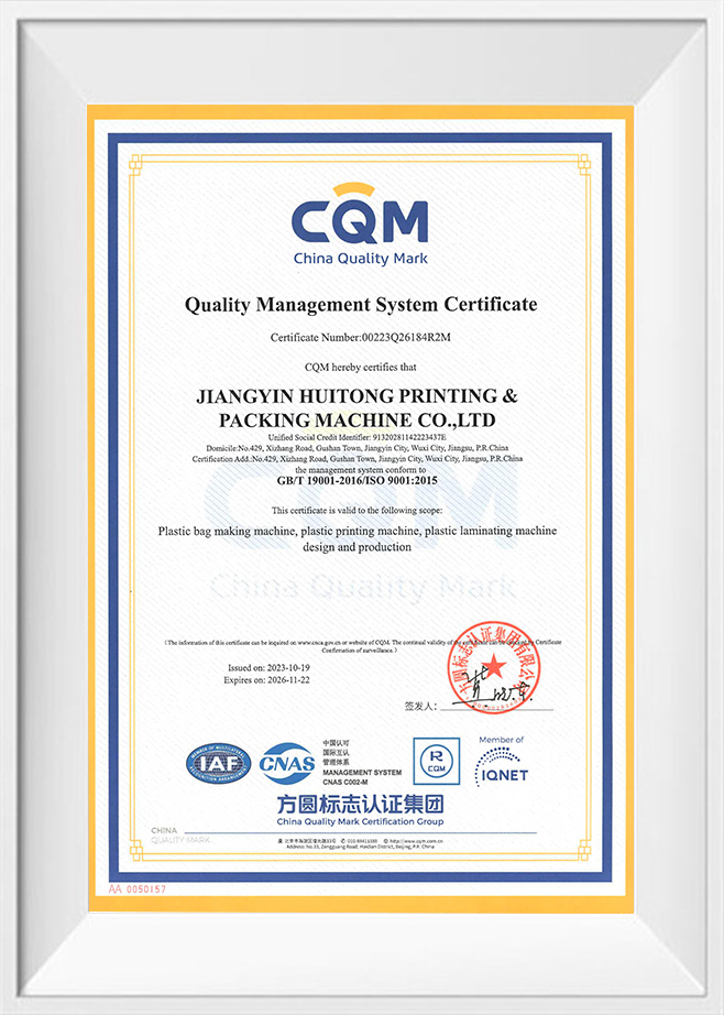 Machines d'emballage Cie., Ltd de Jiangyin Huitong. was established in 1996. It is located in the core area of the Yangtze River Delta Gushan Town, Jiangyin City, and covers an area of more than 100 acres. Professional produce a series of international advanced flexible packaging machinery. Now, Huitong has more than 500 employees. Among them, more than 50 are research and development inventors. The Mission of “facing to the world by innovation” leads Huitong to vigorously focus on research and development of new products. Huitong now has more than 400 patents, including 43 invention patents. Was rated “ High-tech Enterprise in Jiangsu Province”.
